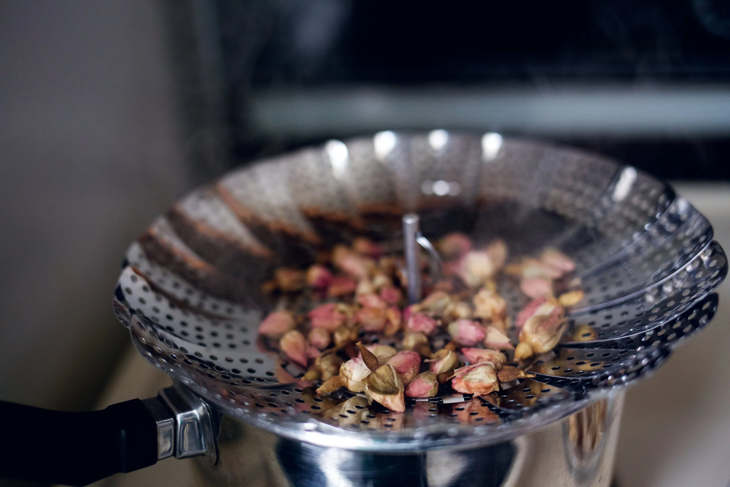 2. Gently steam dried culinary rose petals and buds. This will allow you to better remove the petals without it crumbling. Place petals in a separate container or dish for topping.