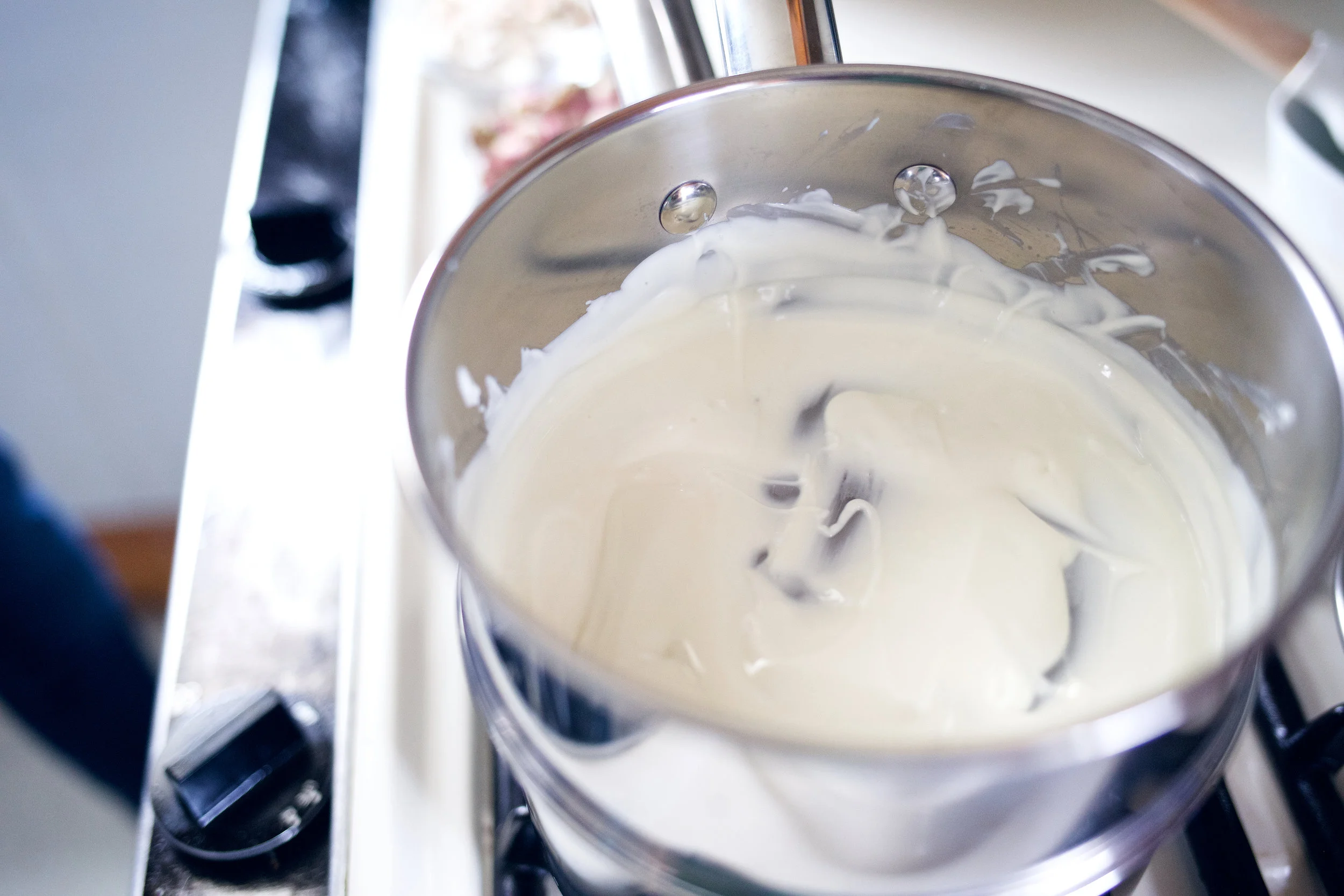 3. Using a double boiler melt the white chocolate. Be sure to not allow the water to boil during the process. While melting, add in vanilla extract and rose water to chocolate.
