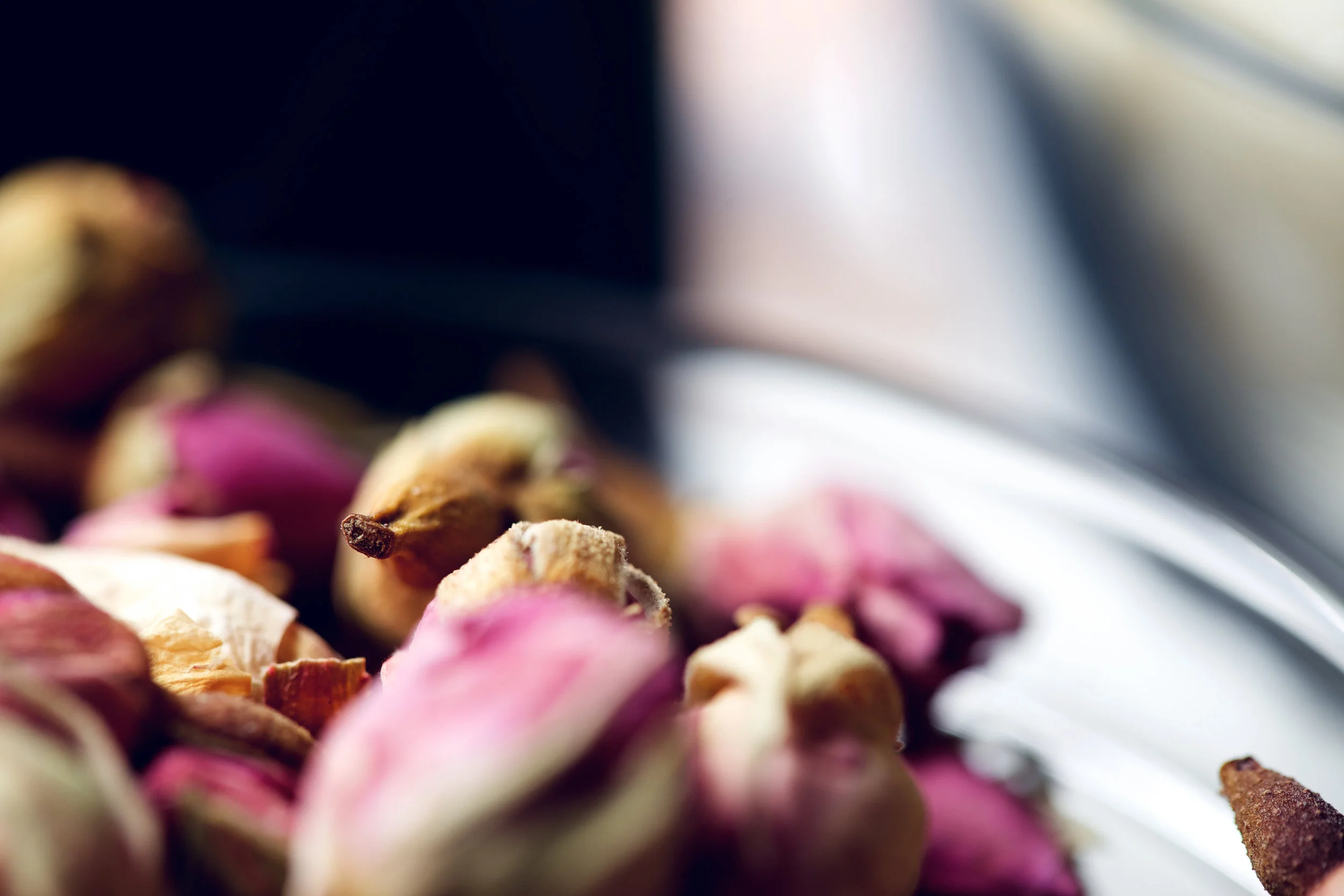 - ½ cup dried culinary rose petals and rose buds
